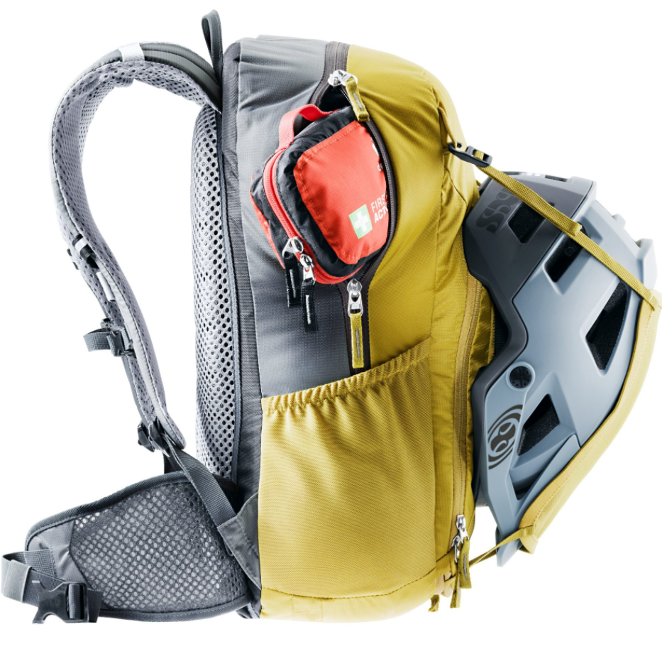 Thanks to the various storage compartments, the Deuter Bike I backpack 20 can be organized easily and conveniently. Thanks to the elastic side pockets, you can easily reach your water bottle and you can store your wallet in the small zipper pocket.