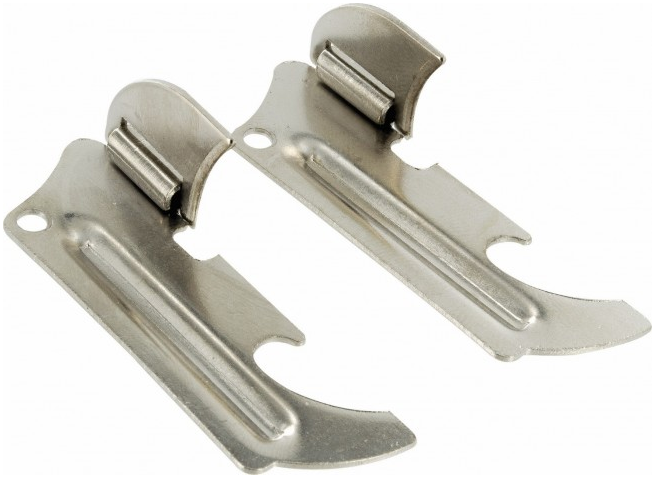 A compact can and bottle opener with retaining ring. Made of nickel-plated rust-resistant steel.