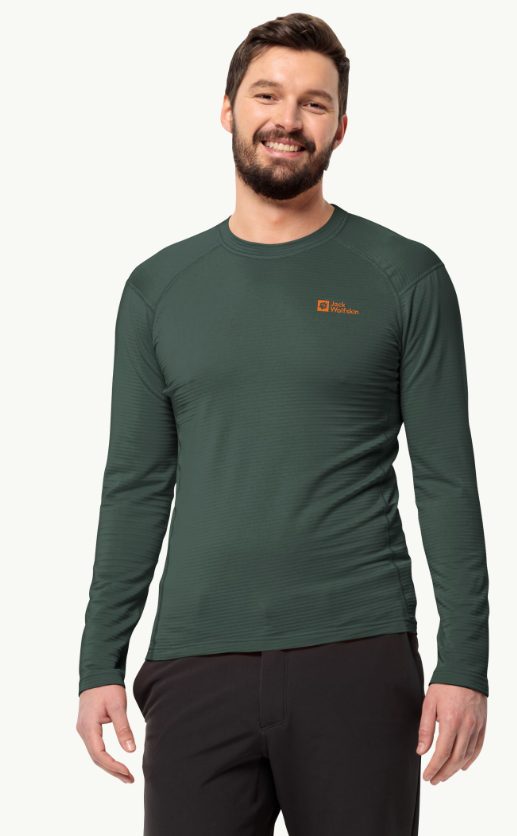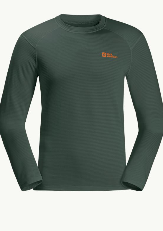 The Jack Wolfskin LS M is a moisture-wicking, breathable long-sleeve shirt. This comfortable shirt can be worn all day long and is suitable as a baselayer and as a separate shirt.